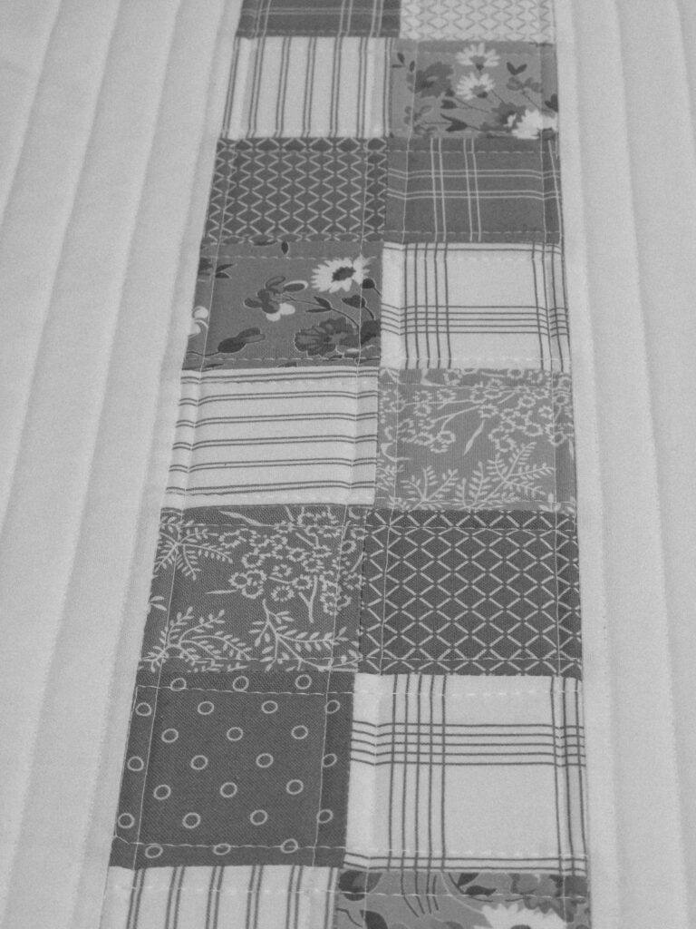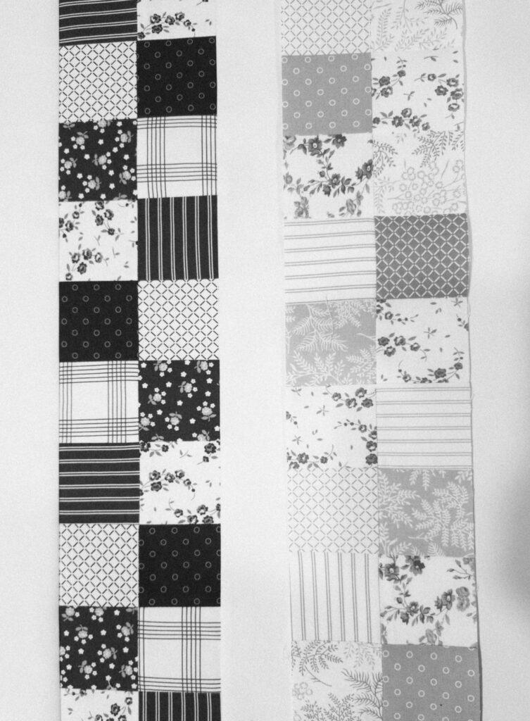 Swinging the pendulum in the opposite direction, I chose fabrics of similar value and color. The result was even worse. High value against white creates too much contrast. Alternatively, the medium value fabrics against the white is too little. As you can see in the images below comparing the color with black and white images, the value differences are loud and clear.